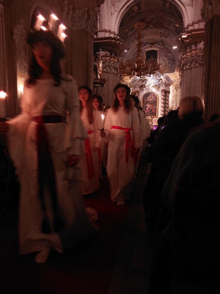 Men själv har jag inte fått bekanta mig med tomten idag, då jag istället har, tack vare svenska ambassaden i Polen, fått njuta av hur medlemmar ur Uppsala domkyrkokör med bravur framförade luciasånger i universitetskyrkan Heliga Anna i Kraków (Kościół św. Anny w Krakowie). Nästa gång jag kommer att få tillfälle att njuta av luciasånger infaller om lite mer än en vecka, när våra fenomenala ettor kommer att framföra sin version av denna uppskattade tradition.