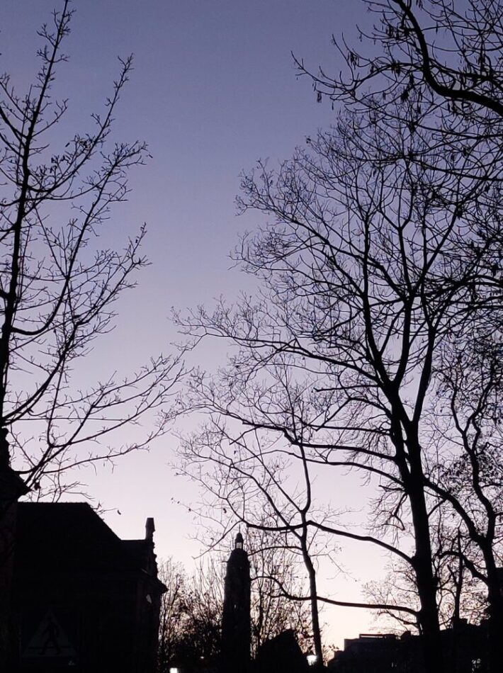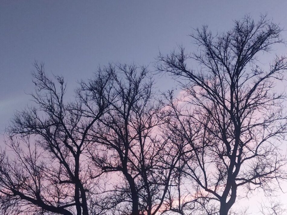 Men innan någon vet ordet av har solen brådskat ner bakom horisonten, som om den kom på sitt misstag att skina upp som en vårsol. Efter sig lämnar den en himmel med en blekblå förnimmelse av att det varit något av en solig dag. Som om allt vore en hägring. Trädens nakna fysionomier spretar med sina knotiga grenar, ivrig avtecknas mot den ljusa blå färgen innan även den har förpassats till minneskartoteket över dagar som gått ut tiden.