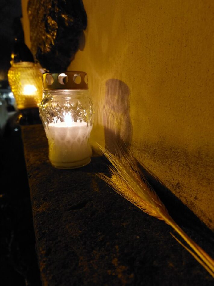 Snöflingorna har nu tydligen samlat mod till sig, och i större antal låter de sig dras med en kylig vind genom Planty, innan de faller med en bestämd duns mot marken. Jag drar upp halsduken över näsan där jag står och tittar på lyktornas sken vid monumentet över offren för holodomor. Ljusen fladdrar lite oroligt. Vid sidan av en av lyktorna ligger två korslagda veteax, och lite längre bort har någon lagt ett bröd och ost till minne av dem som svalt till döds för att de ville bruka sin mark som de gjort i hundratals år, och för att de ville tala sitt språk.
