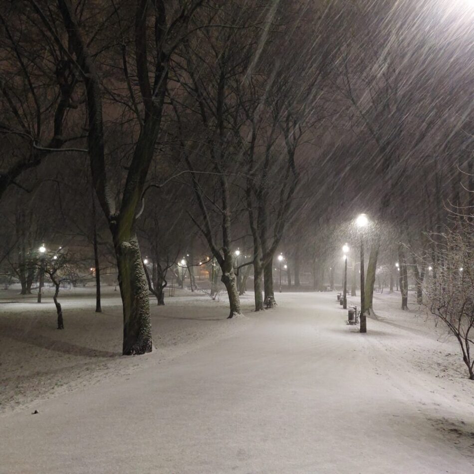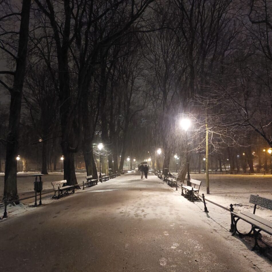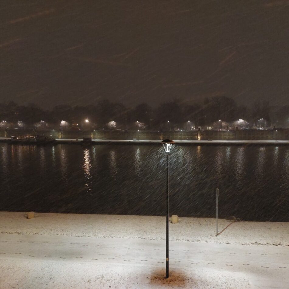 Wisłas svarta kropp skär som brukligt genom staden, ännu är hon inte klädd i is. Hos henne färdas snöflingorna något hastigare, som om de jäktade någonstans. Kanske till ett kärleksmöte någonstans vid flodens strand. Ett snöflingornas tillhåll som snart glöms av tö.
