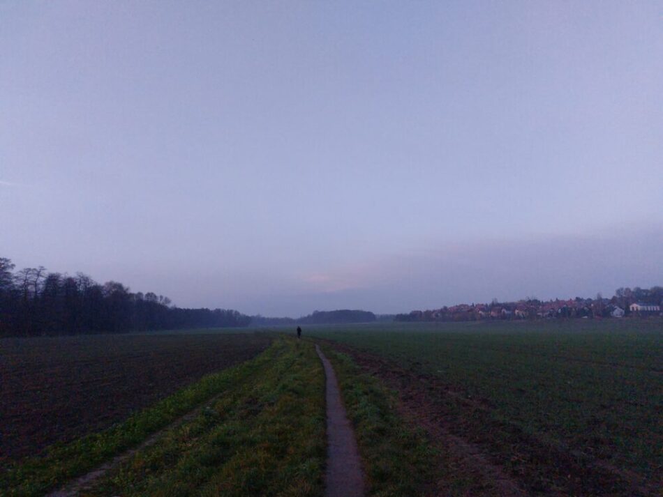I Krakóws utkanter är fälten sedan länge skördade, och böndernas drömmar om nästa sommar syns redan i form av höstsådd. De små, sköra skotten tittar yrvaket och nästan räddhågset upp ur den mörka marken. En svag doft av den raps som skördades här i somras går faktiskt ännu att urskilja. Över fälten syns markens andedräkt svepa fram som tunna sjok av dis, ackompanjerade av det svaga solljuset som skvallrar om att skymningen snart ska ta vid. Och där borta hörs vattendraget Białucha strila fram i den fåra som den dikat ut genom jorden. Runt Białucha står gullriset kvar. Dess gula blommor har dock åldrats och deras kalufs skimrar nu i grått.